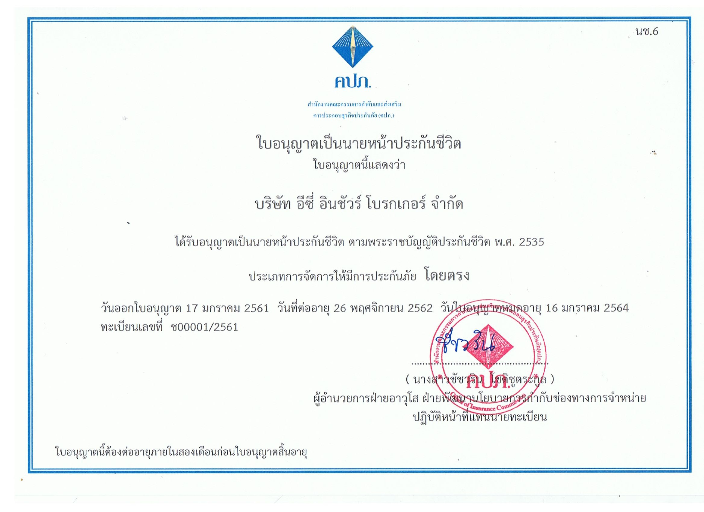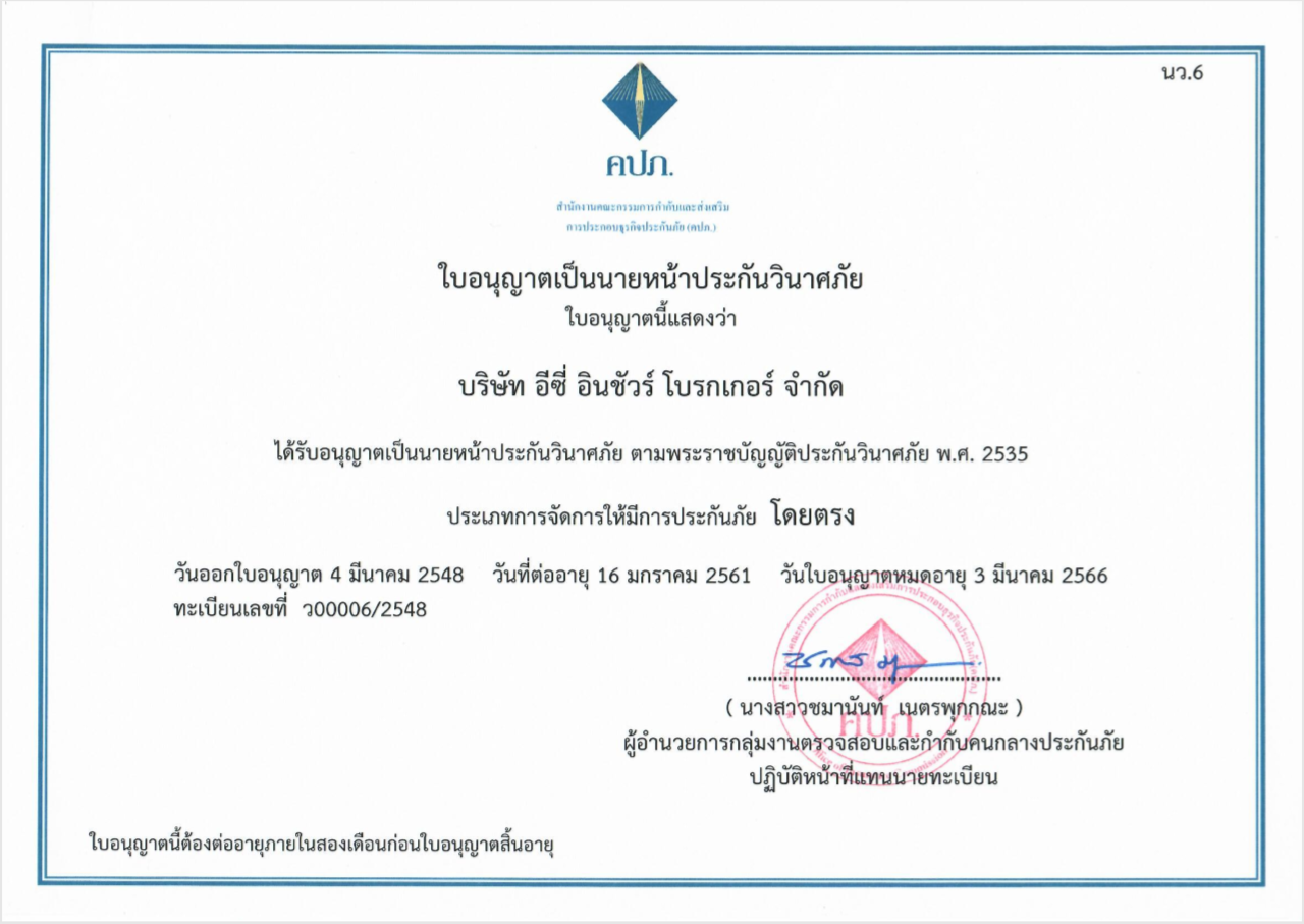 ได้รับอนุญาตเป็นนายหน้าประกันวินาศภัย และประกันชีวิต ตามพระราชบัญญัติประกันวินาศภัย พ.ศ.2535